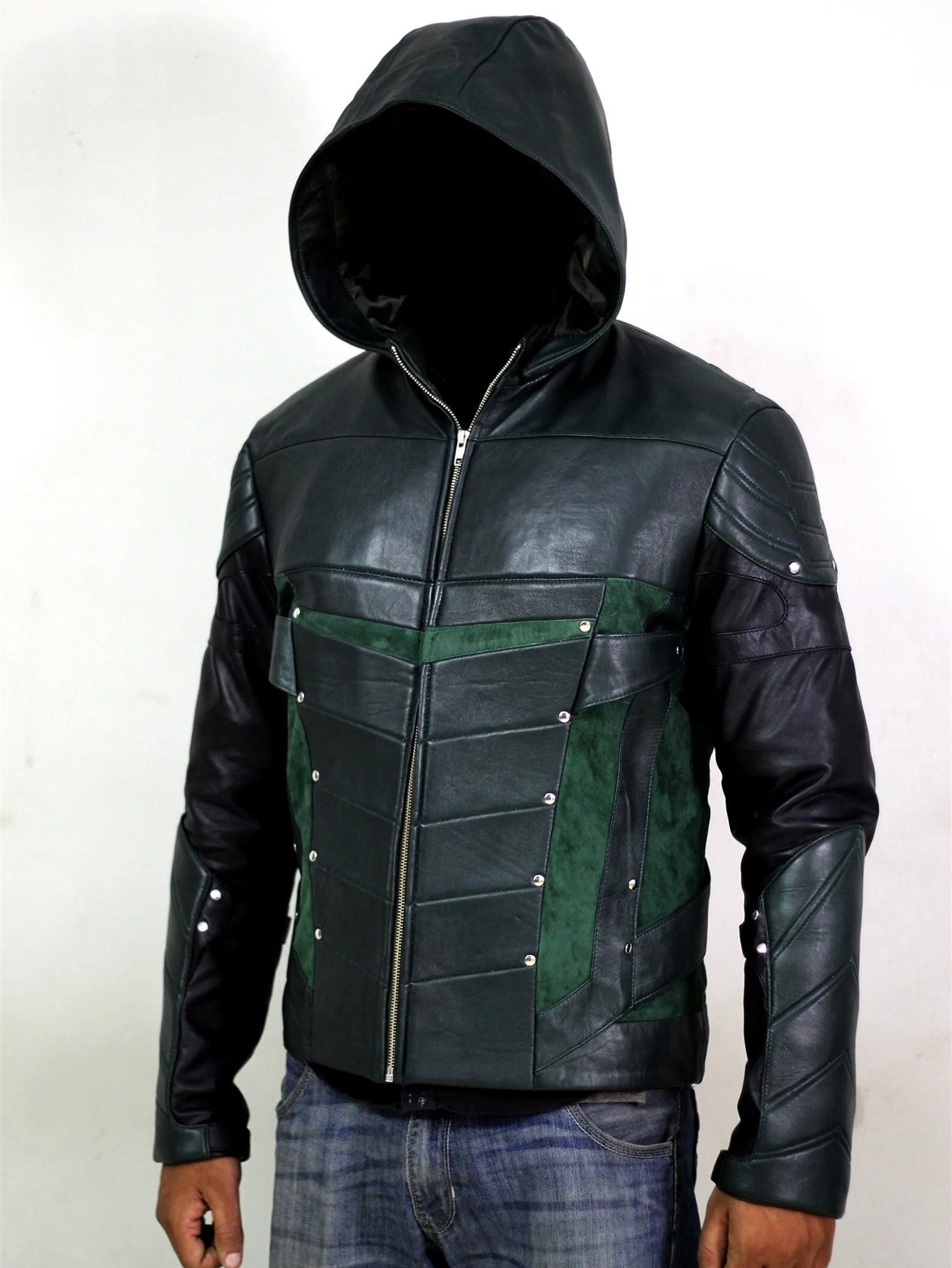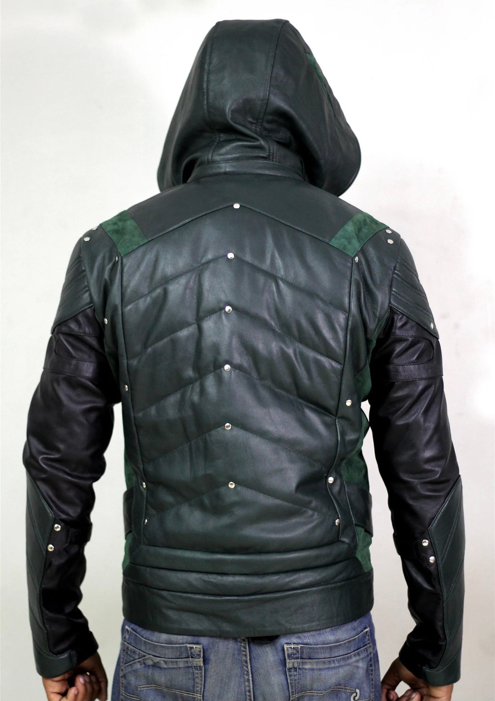 Hardware & Accents: Decorated with small silver-tone rivets or studs along the chest and forearm panels for a rugged, reinforced appearance.
