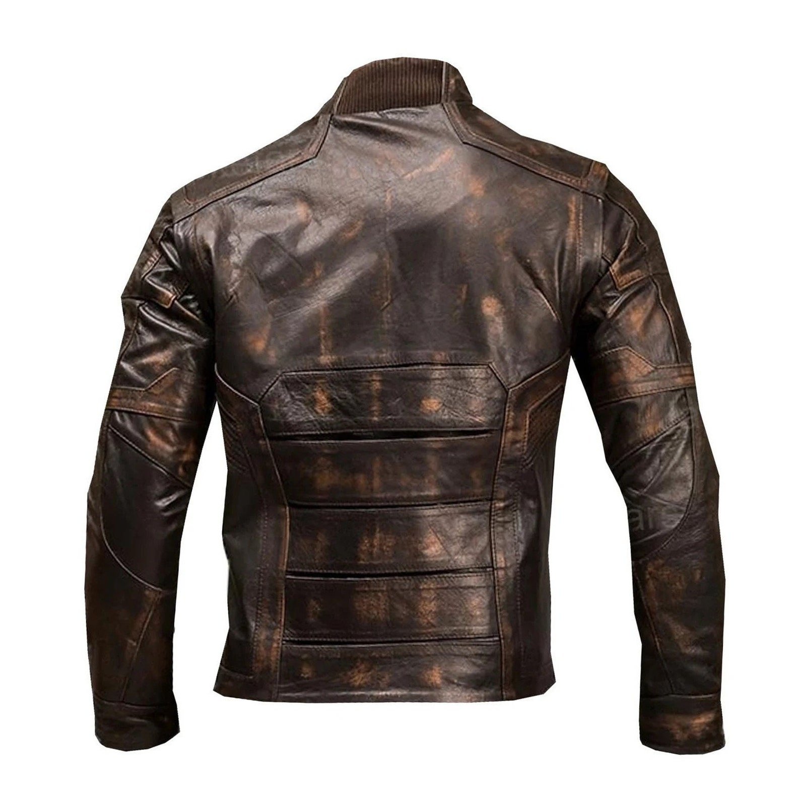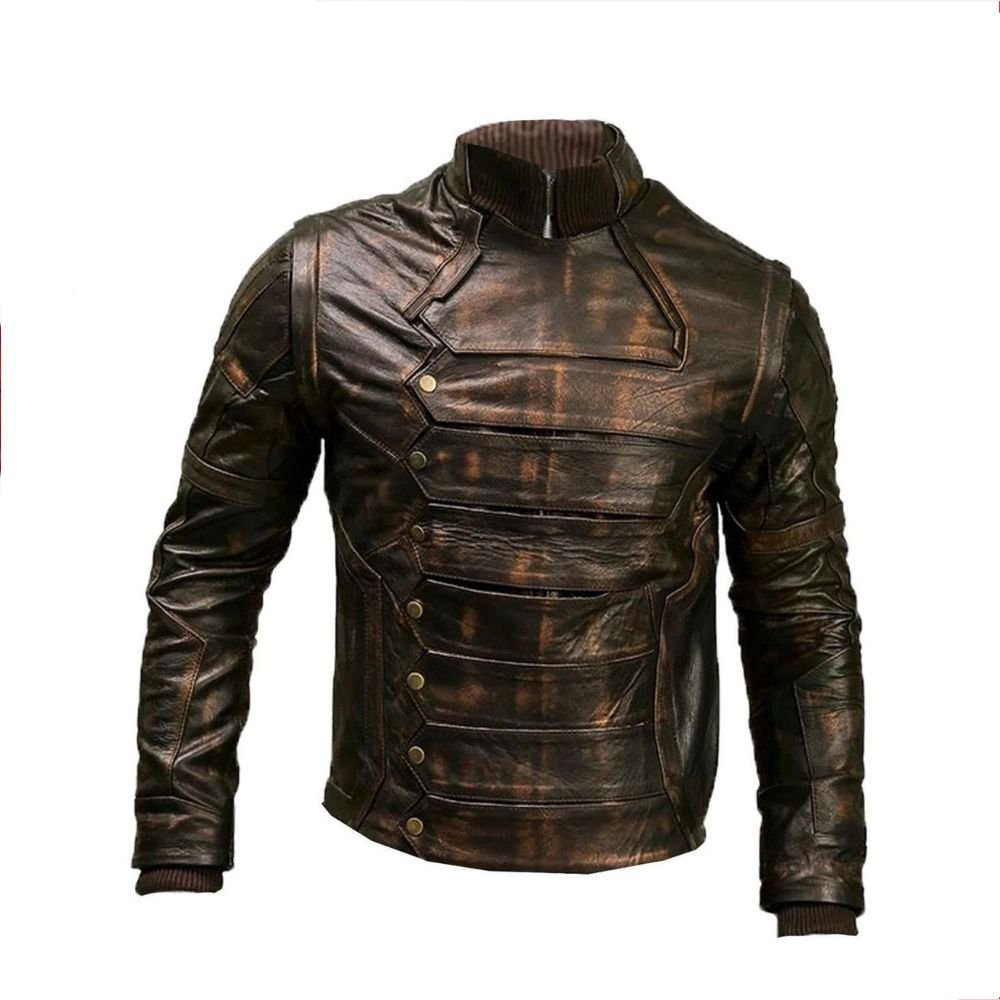 Heavy Distressing: The defining feature of this piece is its “crackled” and heavily distressed brown finish. This patina is designed to give the jacket a lived-in, battle-worn appearance.