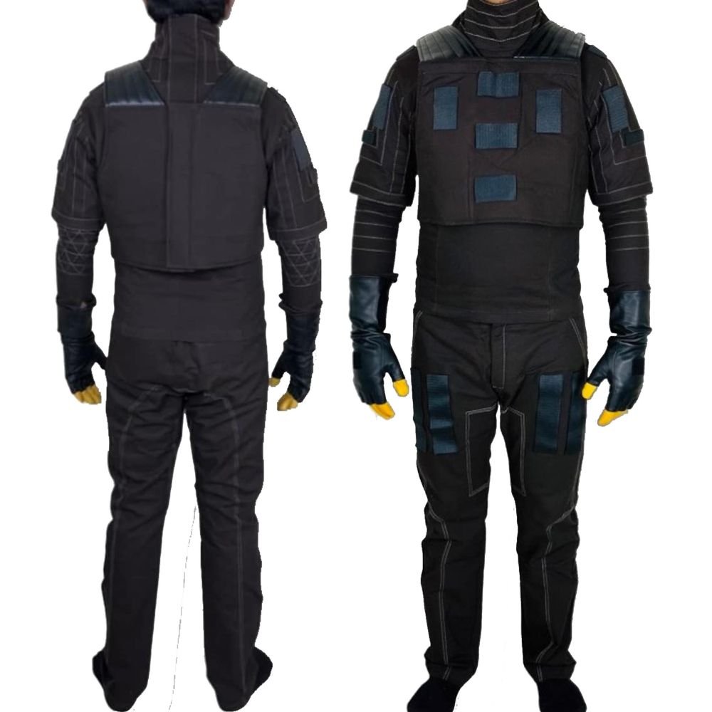 Tactical Undersuit: A full-body charcoal or black suit with complex geometric stitching and quilted patterns on the sleeves and torso to mimic the moisture-reclaiming layers of a true stillsuit.