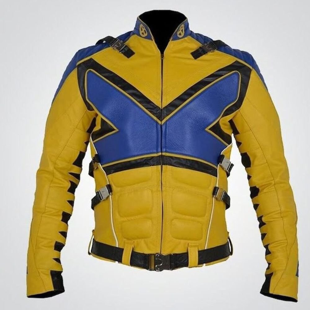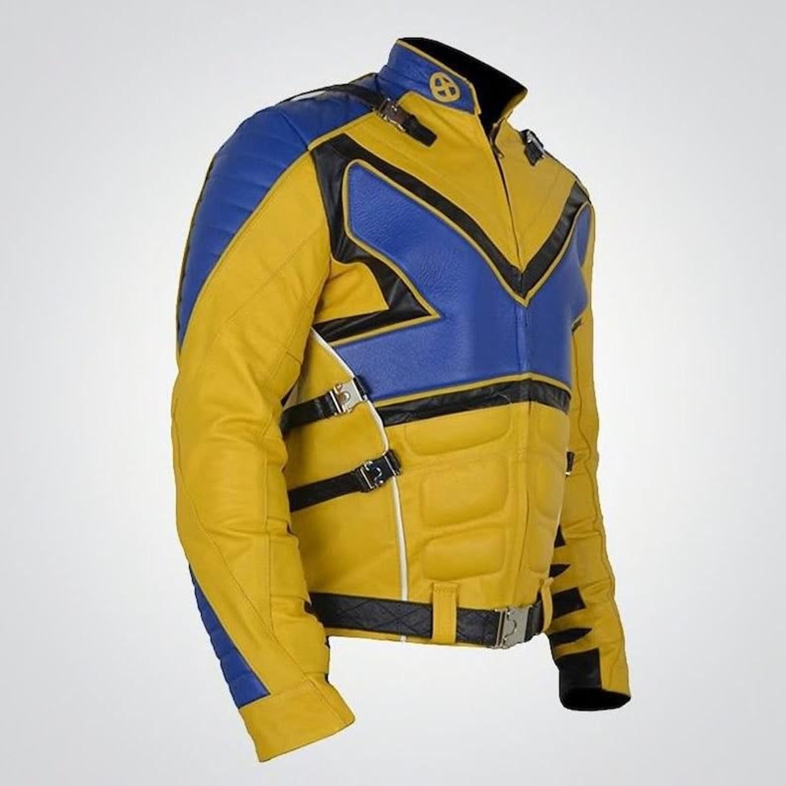Blue and Yellow Superhero Jacket: A highly structured performance piece featuring a bold blue “X” graphic across a yellow torso. The design includes abdominal muscle padding, multiple tactical buckles at the waist and shoulders, and a high stand-up collar.
