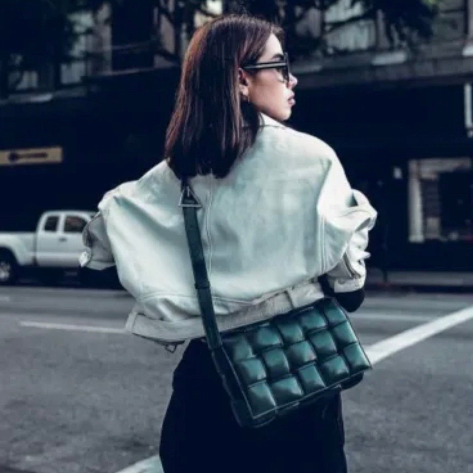 Accessories: Bold, geometric sunglasses and a structured mini-bag help ground the oversized silhouette with sharp, defined edges.